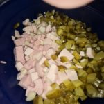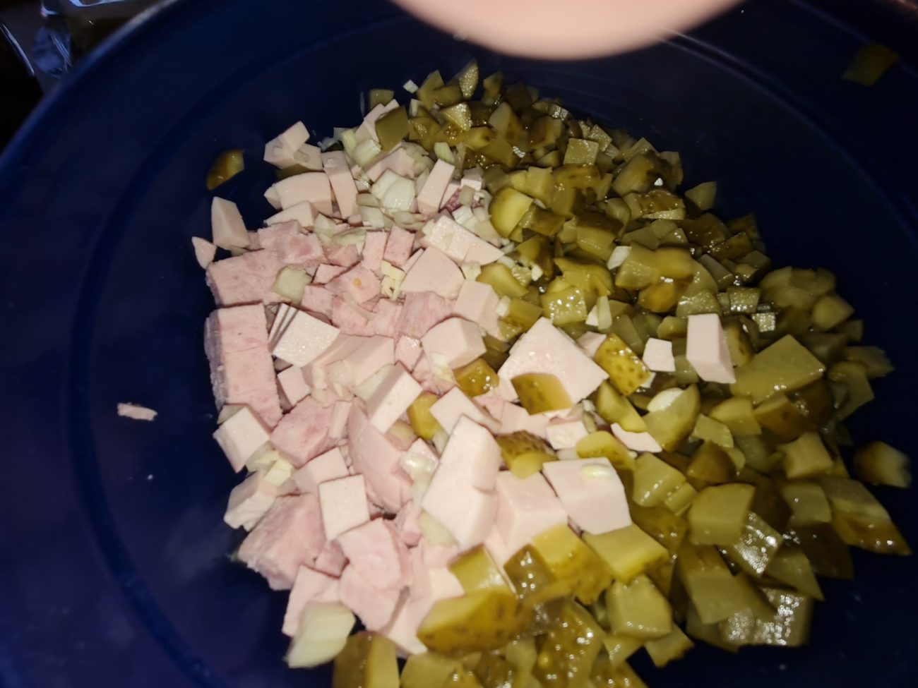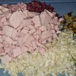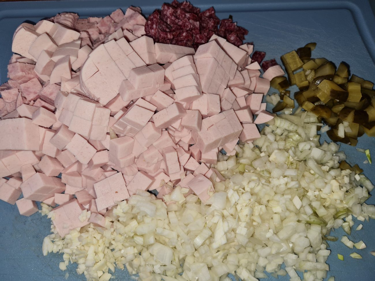 Zutaten kleinschneidenWährend die Kartoffeln kochen, werden alle anderen Zutaten kleingeschnitten. Die Zwiebeln und den Knoblauch sehr fein würfeln. Alles zusammen mit den Möhrenstückchen (aus der Brühe fischen) in eine Schüssel geben. Jetzt kannn man schon leicht durchmischen. Die gekochten und noch heißen (!) Ei schälen, ebenfalls würfeln und in die Schüssel geben. |